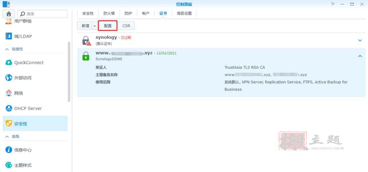 文件夹内的 .crt 后缀文件为证书,.key后缀文件为私钥。请使用具有管理员权限的账号登录您的群晖(Synology)NAS,单击【控制面板】>【安全性】,选择【证书】页签,单击【新增】。如下图所示: