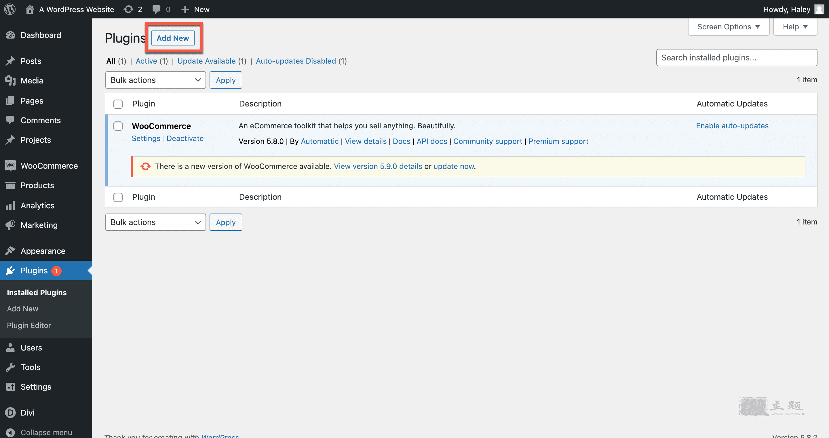 2. 打开一个新的浏览器标签,登录到你的WordPress仪表板,然后点击插件。