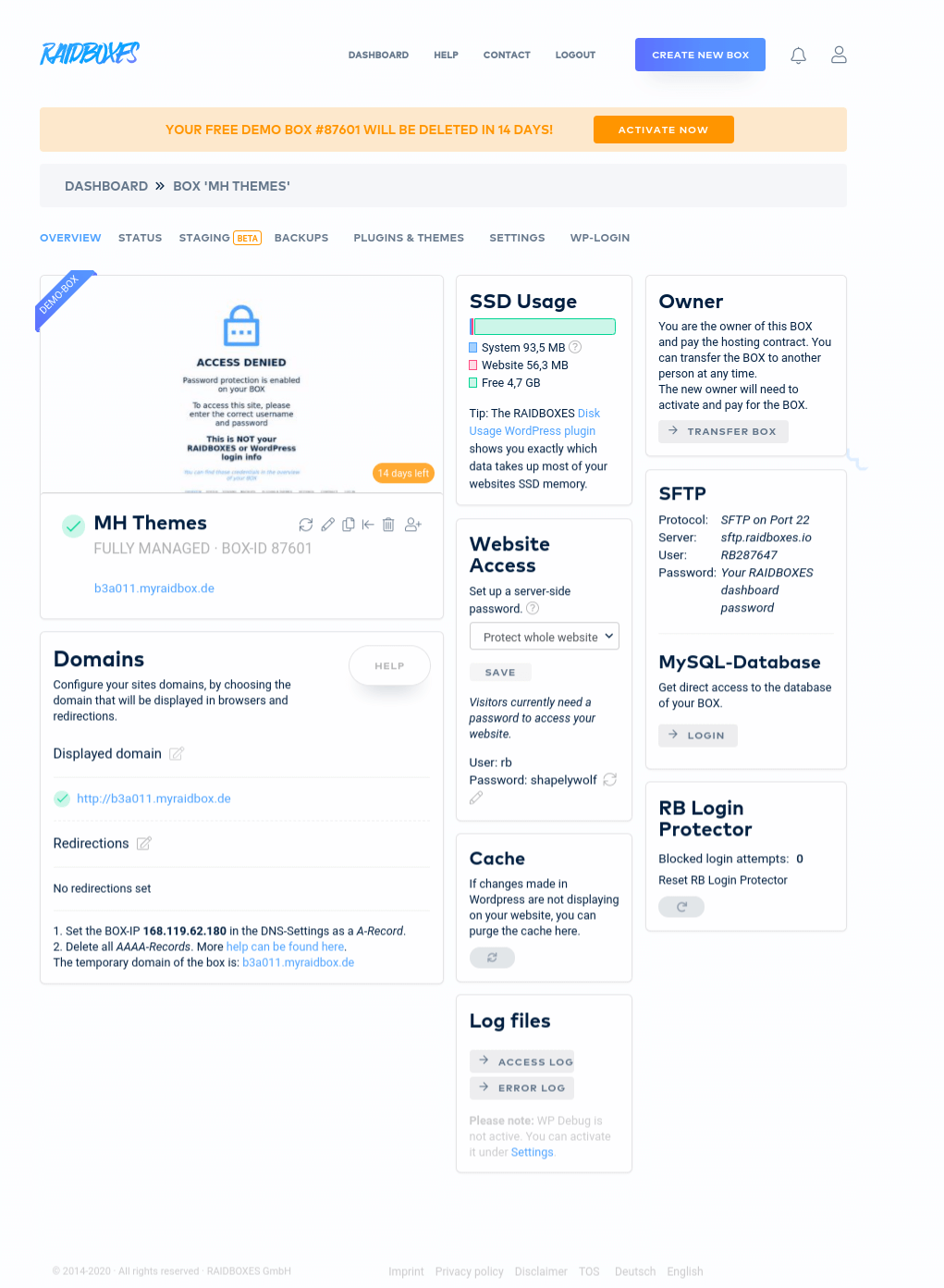RAIDBOXES 仪表板设计简洁,直观且易于导航。 在这里,您可以整体管理您的帐户。 您可以在此处创建新的“框”,即 WordPress 网站以及传输网站。