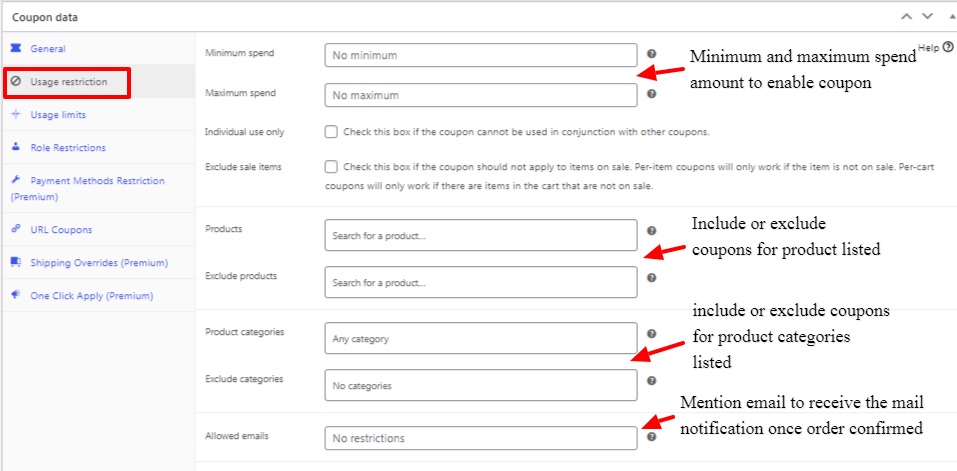 优惠券数据的使用限制类别提供了一种方法,可以根据客户的购买来提及启用优惠券的最低和最高金额。 可用于单个销售的复选框并排除销售项目。 此外,您可以提及产品和类别以启用/禁用优惠券。