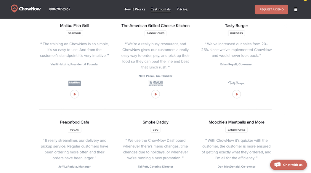 虽然 ChowNow 网站上的每个客户推荐都是视频推荐,但他们也经历并从中提取了最强烈的报价。