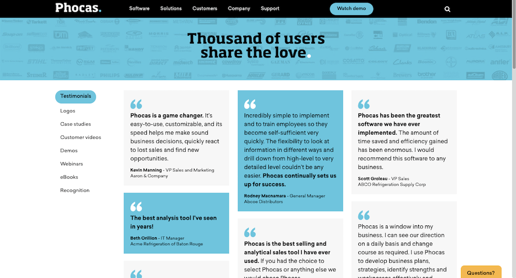 Phocas 的客户推荐页面设计精美。 有现代砖石布局,自始至终充分使用他们的品牌色彩,以及战略性地使用粗体文本来从每个推荐中调出重要的片段。