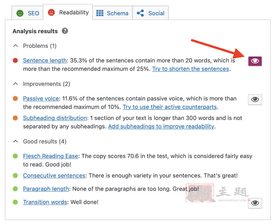 通过点击Yoast可读性建议右侧的眼睛图标,你可以突出文本中的问题,以便轻松找到它。