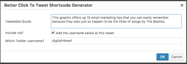 在弹出窗口中,粘贴可推文引用。 如果您想包含您的 Twitter 句柄(您应该这样做,因为它非常适合用于促销目的),请选中该框并验证您的句柄输入是否正确。 这来自您在“设置”页面中输入的内容,因此如果错误,您应该返回该步骤并在下次修复它。