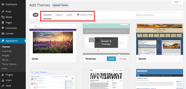 在顶部,您将看到一个标有“添加新”的按钮,单击该按钮。 下一个屏幕将向您展示免费主题的市场。 在顶部栏上,您会找到不同的选项,例如 -![]()