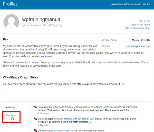 然后,您可以随时通过进入 WordPress.org 个人资料并选择“收藏夹”选项卡来查看所有收藏项目的列表。