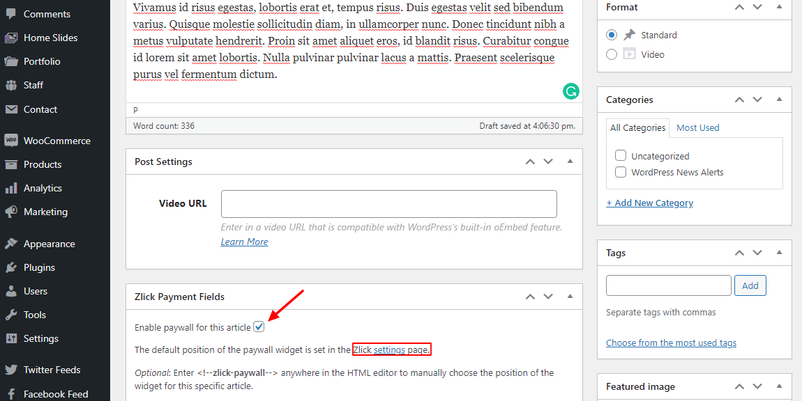 你怎么问? 在您的帖子编辑器中,轻弹 为本文启用付费专区 复选框,如下图所示。