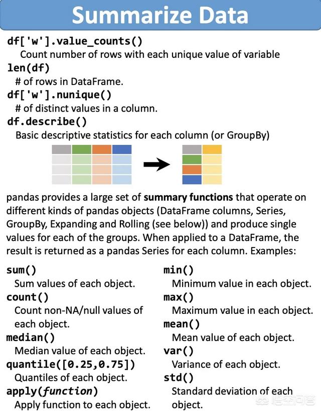 所以你应该这样用这份小抄,把它当成速查表,「用于了解哪些操作可以用Pandas完成」,在你不确定或者不明白如何处理数据时,通过这份速查表快速查到Pandas中的哪个方法可以完成,之后再进一步通过搜索学习对应的方法!