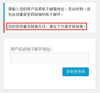 通过这样的操作,新用户顺利收到了注册邮件,但点击设置密码的链接时,却重复跳出重置密码的提示。Wordpress提示“您的密码重设链接无效,请在下方请求新链接。”在寻回密码时,发送给用户的重置密码链接也是如此。