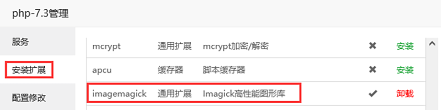 根据上面的错误提示基本可以明确问题是出在服务器上,服务器缺少了对 webp 格式图像的支持。找到了问题的根源我们就好对症下药了,我们只需要安装并开启 PHP 的扩展 ImageMagick 就可以了。怎么安装呢?我们这里以常用的宝塔面板,php7.3 举例说明: