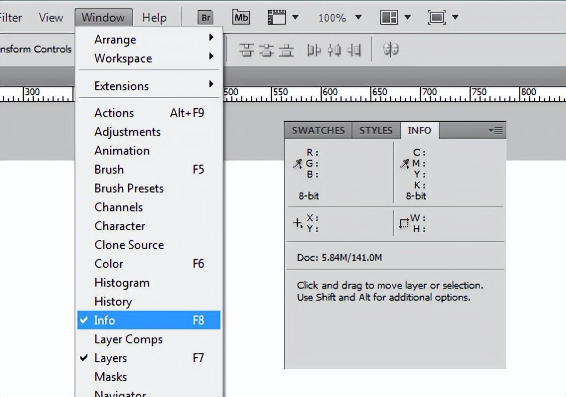 使用标尺工具时,信息面板也非常重要,用标尺进行测量时,相关信息会显示在信息面板。如果没有显示,你可以到窗口(Windows)勾选上信息(Info)这一选项。