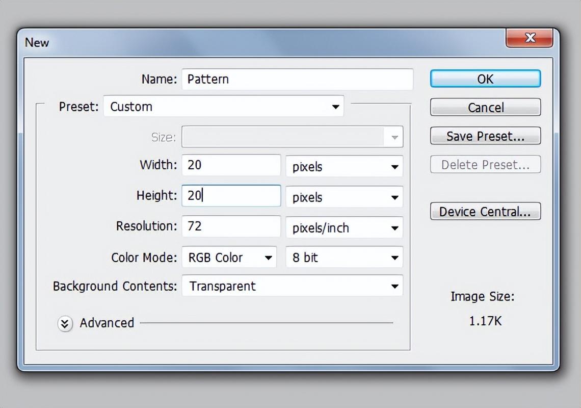 用#081010颜色填充背景图层。接下来,创建一个网格图案。该图案的文档大小为20像素 x 20像素,背景为透明。