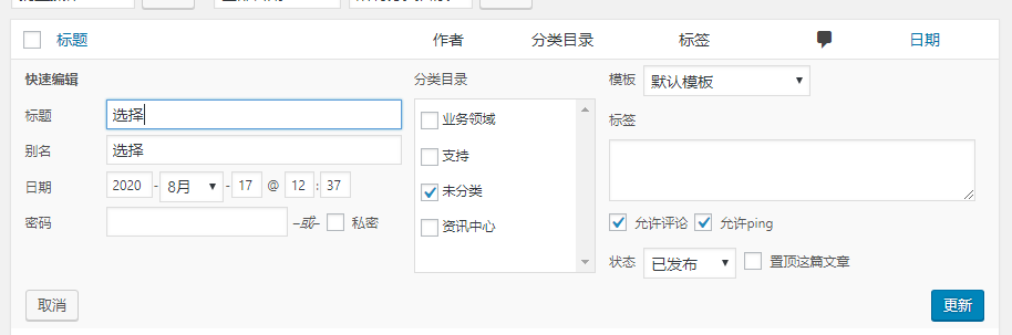 快速编辑可以编辑文章的标题、别名、日期、时间、分类、标签、模板、评论、ping、状态、置顶等属性。