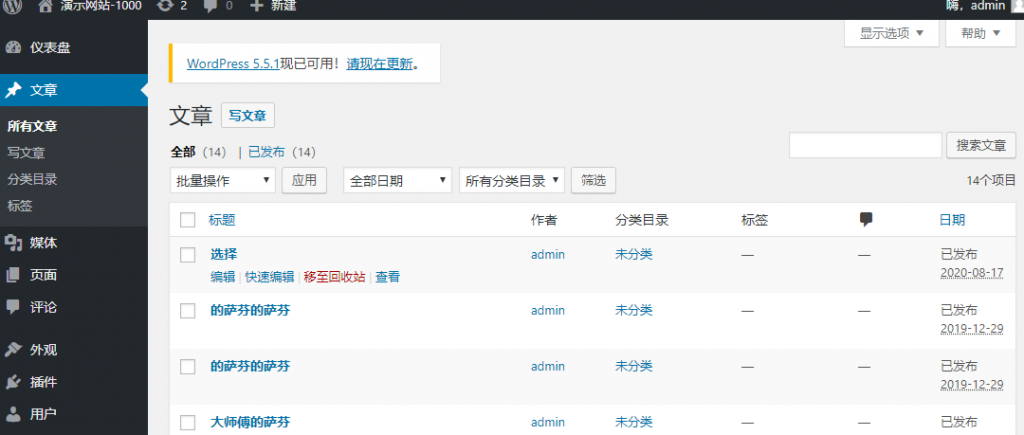 鼠标移动到某一篇文章上会出现编辑、快速编辑、移至回收站、查看等操作。
