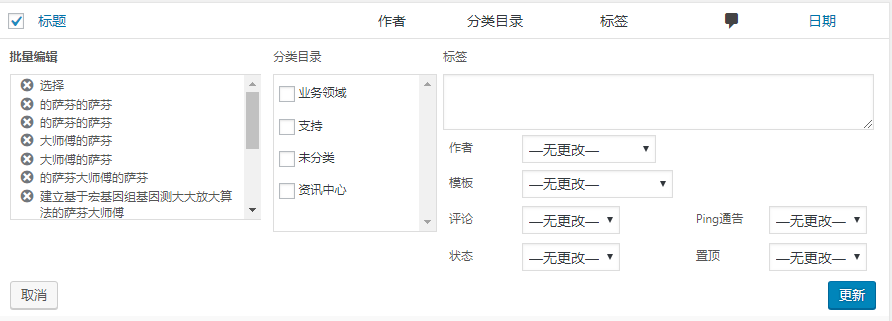 批量编辑,选择多篇文章后点击批量编辑会在当前窗口打开批量编辑表单,允许编辑的内容如下: