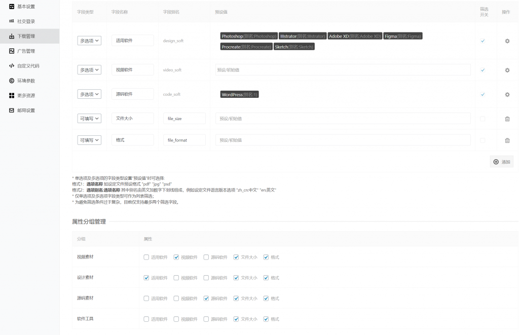 - 丰富的下载字段管理,站点可以针对不同类型的资源,自定义资源属性,如文件大小、格式及资源兼容软件等;