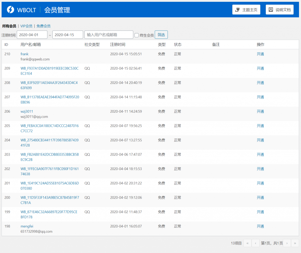 Triple主题采用了闪电博自主开发的会员系统。其中: