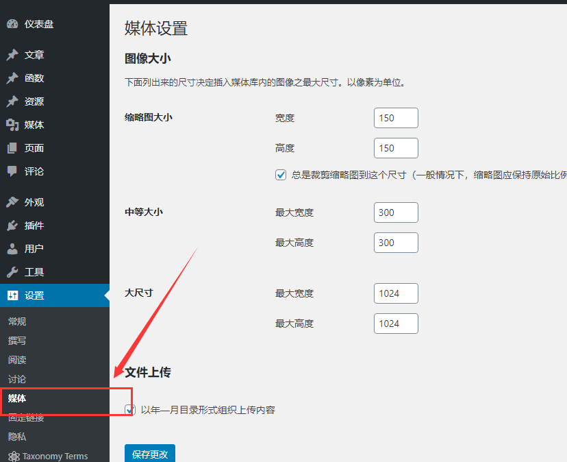主要用于设置文章缩略图大小和存储目录组成形式。内容比较简单,就可以不足说明了,以年-月目录形式组织上传内容,勾选后,uploads文件夹下面会显示为2020/10/name.jpg。这种形式比较方便管理,建议勾选