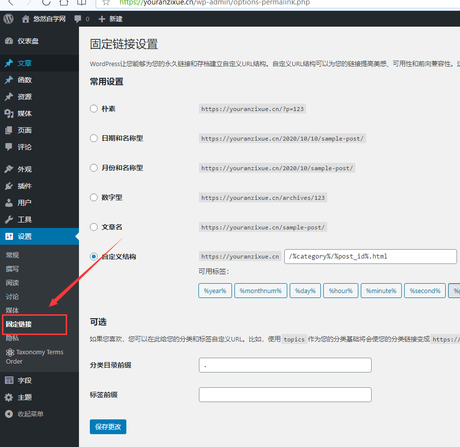 固定链接用于设置网站的网址,包括文章、分类、页面等网页的URL。如果你的服务器没有配置伪静态规则,请使用第一项:朴素,否则会到账你的页面打开时显示404错误。分类目录前缀填写英文的点可以去除分类中的category字符。标签前缀可以给标签添加固定的标识。伪静态规则设置后期教程中会讲解。