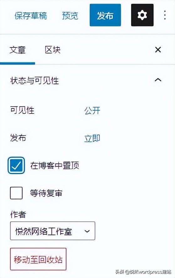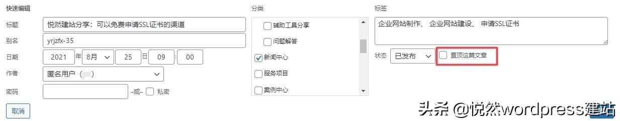 温馨提示:wordpress网站自带的置顶功能主要是针对博客网站中,但是很多企业网站因为都是二次开发过的,有些还取消也自带的配置功能,所以有些wordpress企业网站可能配置功能不会生效。此时可以尝试找第三方的置顶插件代替。