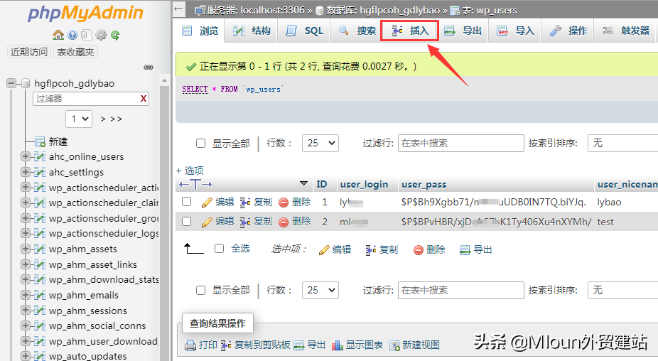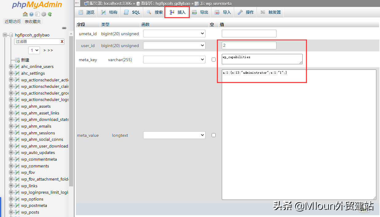 继续操作,转到wp_usermeta表格并单击“插入”。同样,名称可能略有不同 – 只需查找显示[xxxxxx]_usermeta.