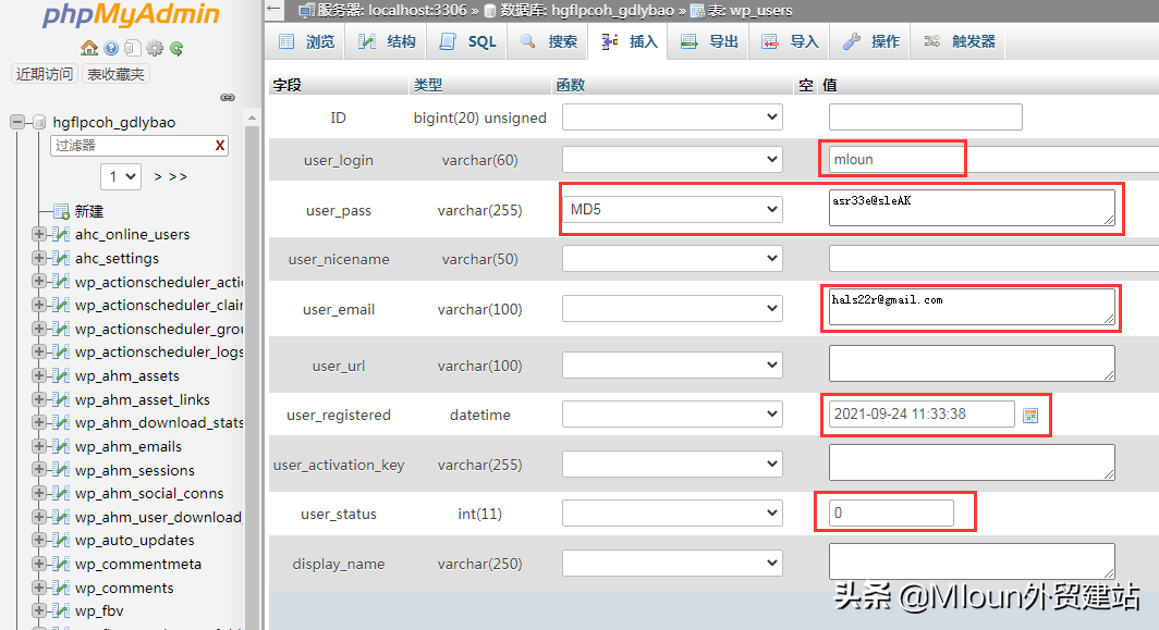 user_pass:为帐户添加密码,然后在功能下拉列表中选择MD5。