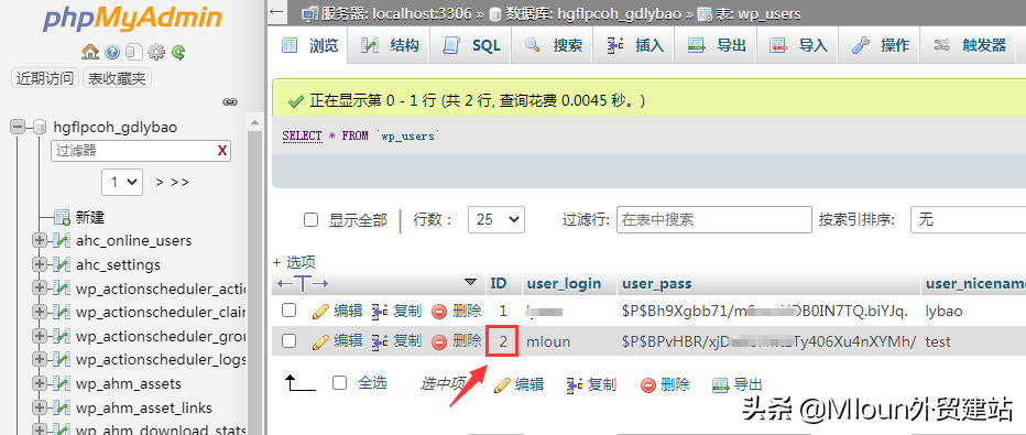 点击“执行”后,您应该会看到一个成功屏幕。如果您返回wp_users表格,您应该会看到您的新用户。注意ID列中的值,因为您将在下一步中需要它: