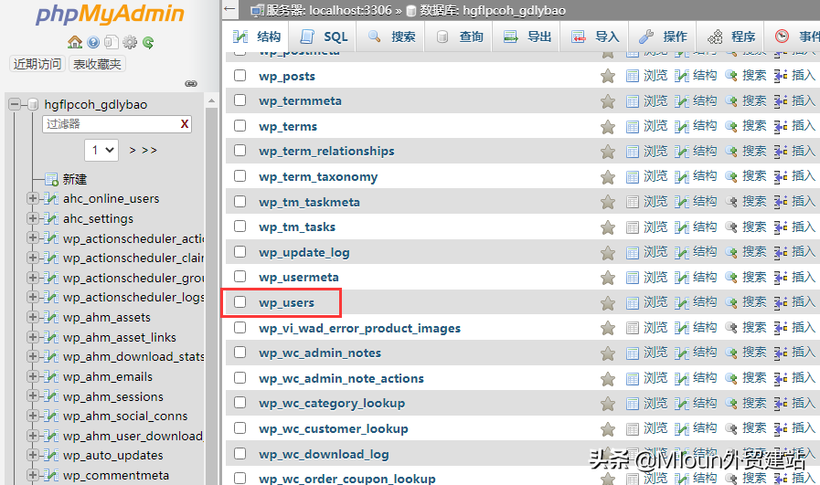 现在,从左侧的数据库列表中选择您的WordPress 站点的数据库。然后,点击wp_users表。