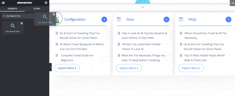 之后,只需在 Elementor 编辑器的 "搜索 "面板中寻找 BetterDocs "文档搜索表 "元素,并在 "+"号部分拖放该元素。