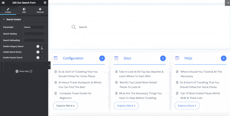 由于你已经在Elementor中完全配置了你的BetterDocs文档搜索表单的高级搜索功能,你现在可以按照你想要的方式来 "设计 "你的文档搜索表单。