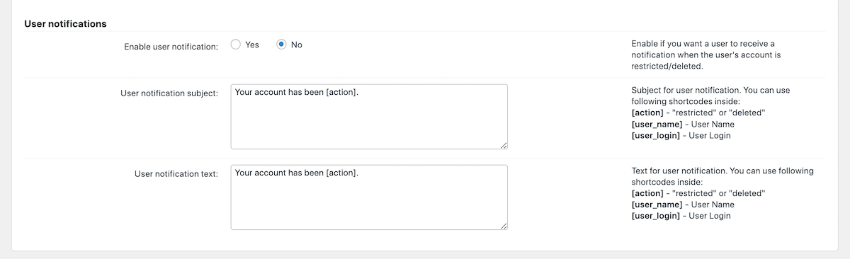在管理员下方,您会看到一些选项,用于在用户帐户受到限制或删除时通知用户。