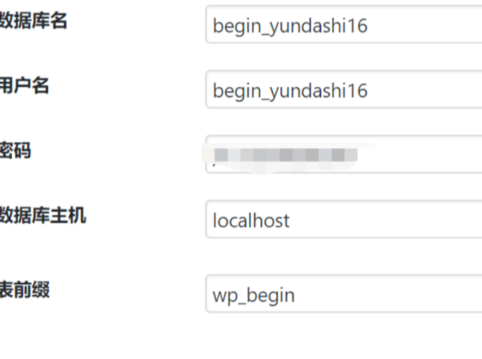 第六步:填写数据库信息。填写数据库名、数据库用户名、数据库密码等信息。