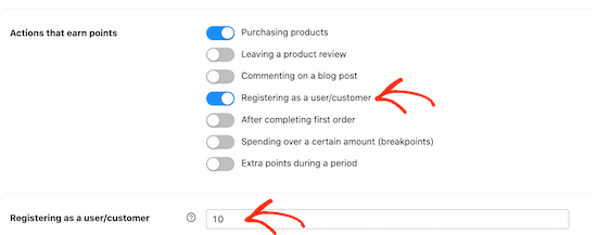 只需滚动到“积分数量”部分,然后单击开关即可执行任何可赚取客户积分的操作。
