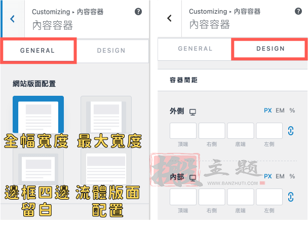 前往「 全局> 内容容器」,即可设置网站版面配置。GENRAL 可设置网站版面配置、DESIGN 则可设置更详细的内外侧间距。