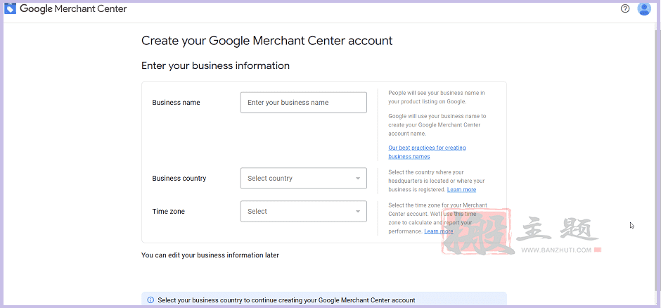 使用您的 Google 帐户登录,然后输入与您的业务相关的详细信息,例如业务国家/地区、时区和业务名称。